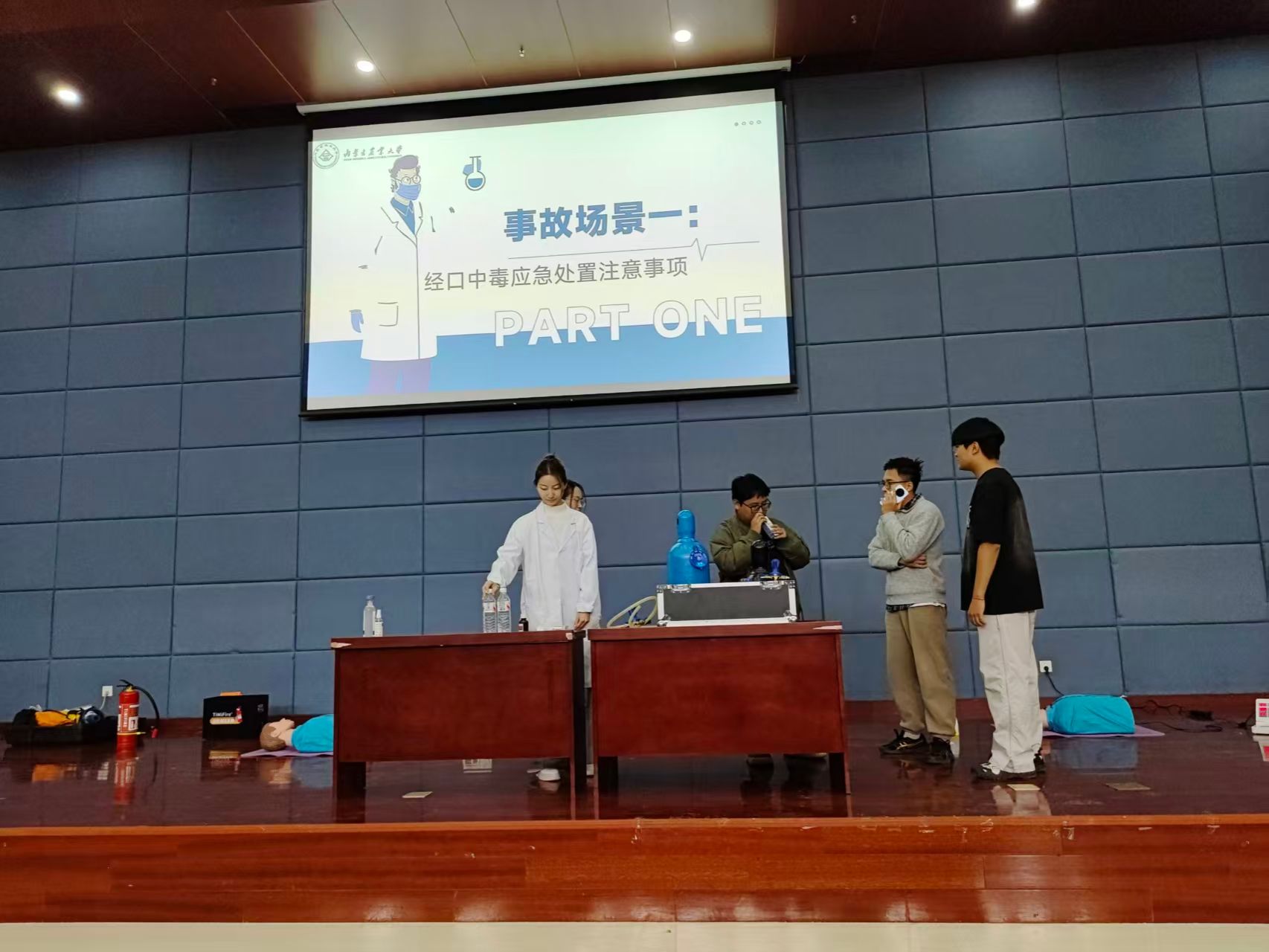 下午举行的实战应急演练环节采用“情景模拟+互动体验”方式,刘存老师与现场同学互动示范,模拟了实验室中毒处理、气体泄漏、火灾烧伤、化学品灼伤、心肺复苏等多种突发情况的应急处置流程。通过现场演练,师生们亲身体验并掌握了正确的中毒应急处理、灭火器材使用、紧急喷淋冲洗、心肺复苏等关键技能,进一步提升了实验室安全意识和应急处置能力。
